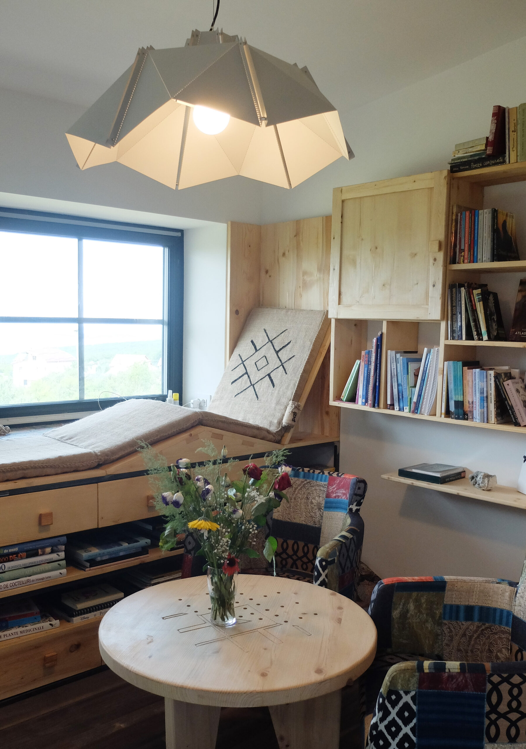 – Rafturi întinse pe doi pereți, în L, asimetrice – lemn masiv
