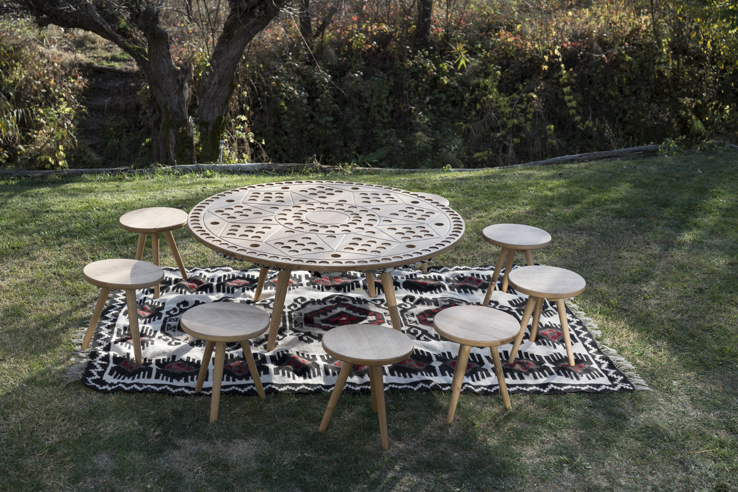 La prima vedere observăm soarele. „ Semnele solare inundă, în mod irezistibil, forma și decorul obiectelor din ambianța țărănească, obiecte realizate din materiale diferite, prin tehnici diferite și mai ales cu funcționalități diferite”(Constantin Prut, Calea Rătăcită). Dar dacă privim în profunzime, rozeta este alcătuită din nouă personaje, fiecare aparținând unei regiuni din România (Banat, Bucovina, Crișana, Dobrogea, Maramureș, Moldova, Muntenia, Oltenia, Transilvania). Dansatorii se țin de mână și alcătuiesc perfecțiunea. Centralitatea și mișcarea anunță limbajul solar, provenit din cosmosul gândirii populare. Dacă analizăm elementele din care este alcătuit desenul horei, observăm simboluri precum „unda apei”, văzută din perspectiva zig-zagului. Valurile mereu reluate înseamnă puls, curgere, respirare, înseamnă rostogolire a clipelor prin istorie. Aceste forme vechi sunt impregnate încă de prestigiul apelor primordiale. Aceleași simboluri crestate reprezintă și „dinții de lup”, al căror dinamism se suprapune peste elementele statice solare, cum ar fi „rombul” sau „roata”. Rombul instituie în imagine un nou sentiment spațial și temporal. Este o formă care, desi are colțuri, reprezintă soarele. Preluat dintr-o lume care pare imaginară, rombul se repetă de nouă ori în desenul cercului și este pregătit să călătorească „peste nouă mări și țări”. „V-ul repetat, cap la cap, dă naștere X-ului; dar și rombului, dacă simetria pornește, dimpotrivă, de la cele două ramuri depărtate. Prima figură închisă a geometriei și-a făcut apariția; faptul că centrul este indicat printr-un punct dovedește din plin că omul prehistoric este conștient de ea.” (R. Huyge, Op. Cit., p.122.) „Roata”, asociată cu trecerea timpului, ne arată că împreună suntem mai puternici, ca într-o horă. La finalul călătoriei prin simbolistică dezvăluim un ultim „prim element” – „punctul” – care reprezintă, în plan spiritual, sediul capacității umane de a locui lumea. Instituirea punctului apare ca o fază necesară a jocului intelectual, iar aici face parte din imaginea stilizată a omului. Lemnul de fag, cu finețea fibrei și culoarea plăcută, își va continua viața prin artă, iar un alt strămoș de-al lui va fi plantat în schimb, pentru a duce mai departe povestea. Crestătura cu dalta în lemn este o sursă de inspirație continuă și astfel, cu ajutorul tehnicii moderne, au fost făcute șanțuri firave în medalioanele rotunde, unice ca formă și aspect. Finisajul manual durează mult și este migălos, fiecare obiect fiind ales cu grijă.