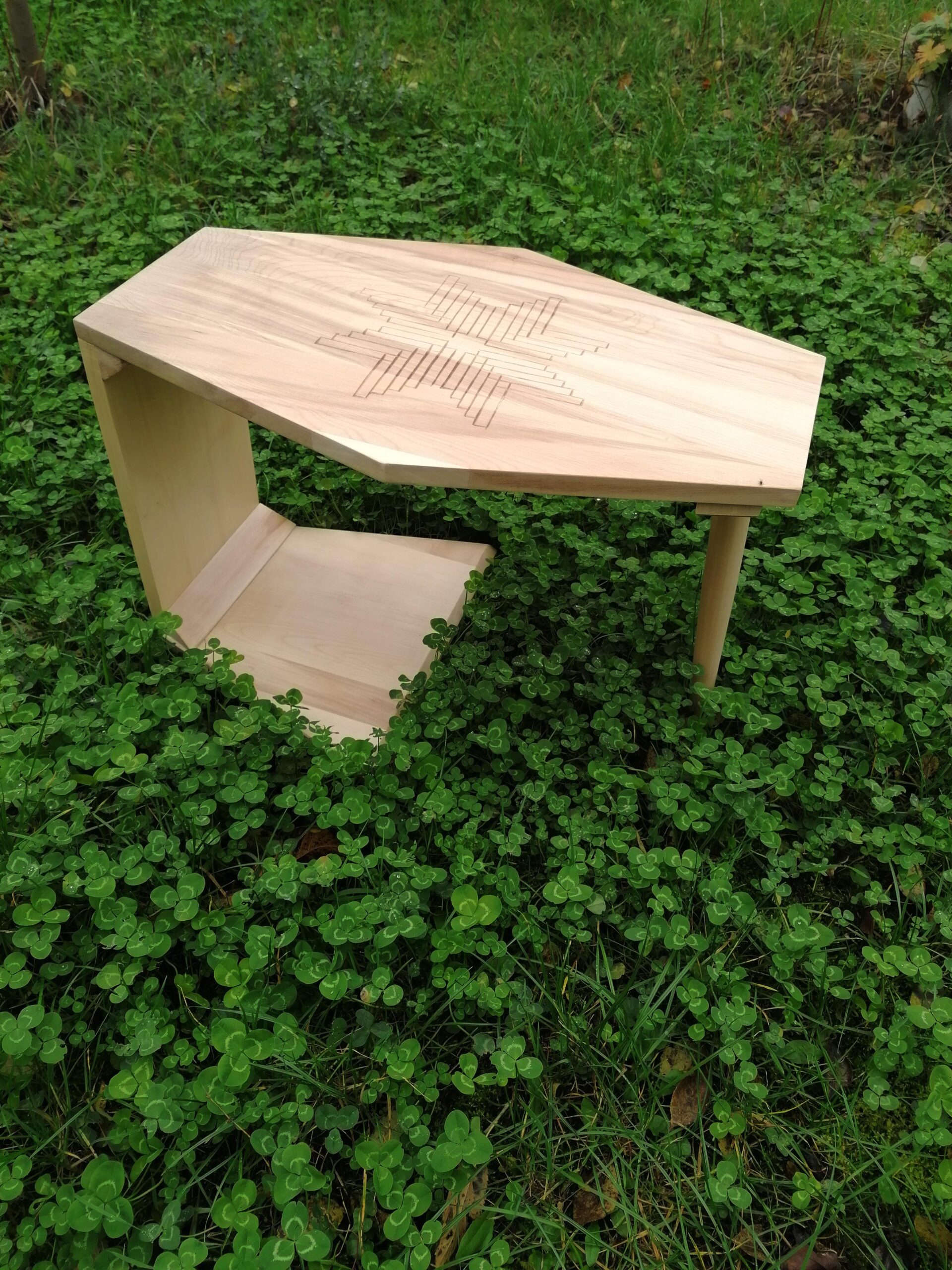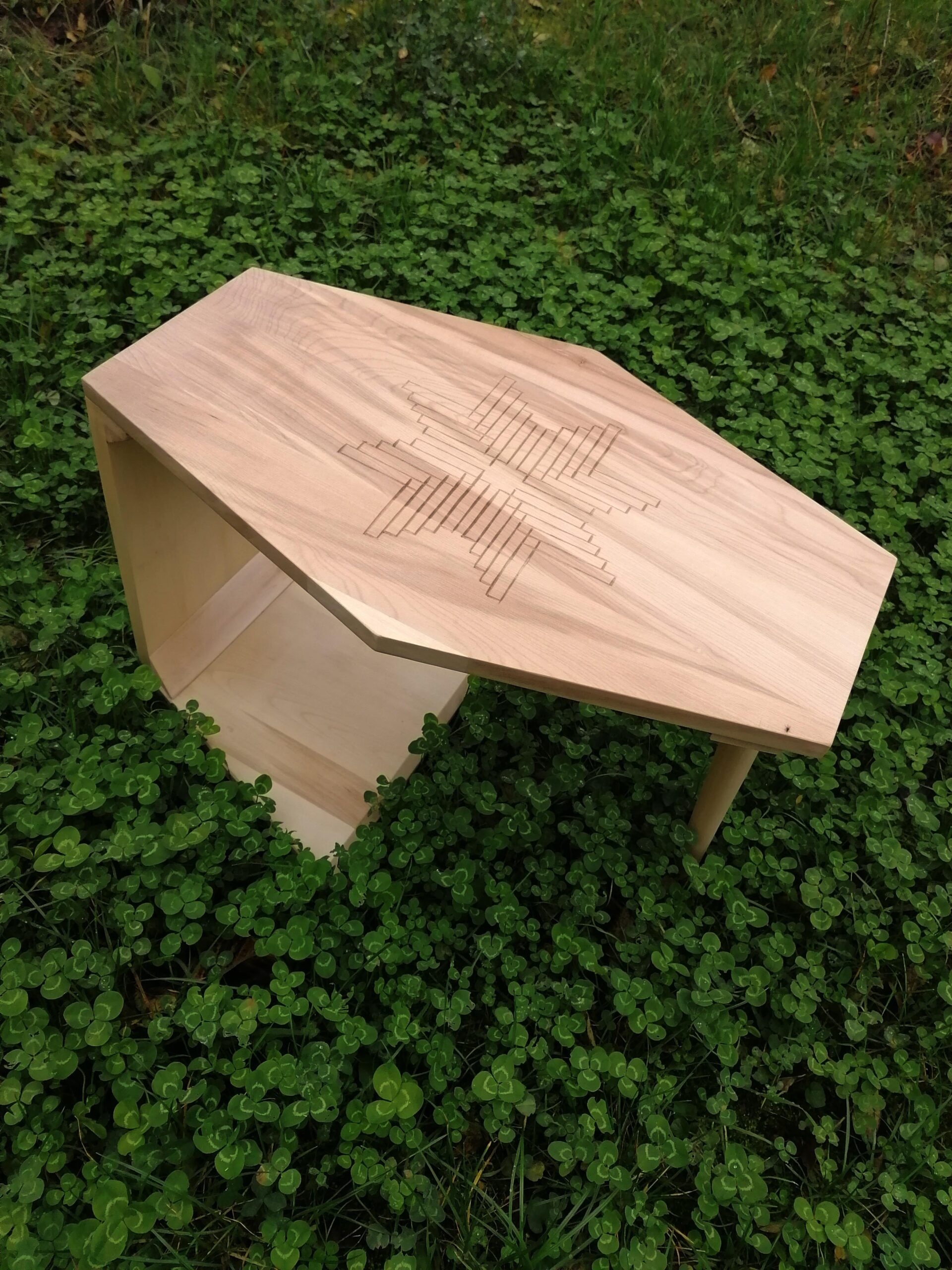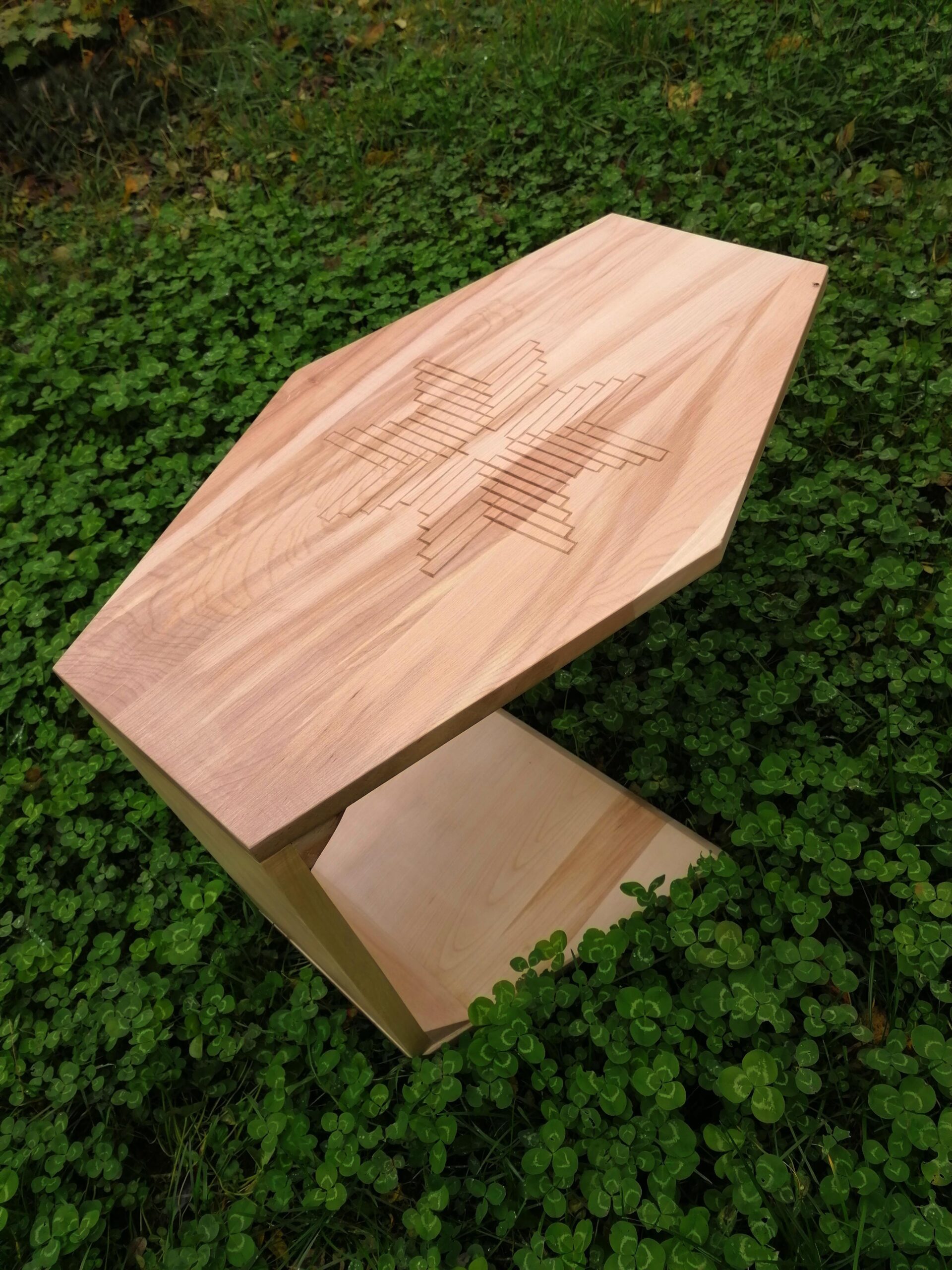 Steaua cu 8 colțuri simbolizează echilibrul, speranța și regenerarea. Crestată cu dalta pe o măsuță de cafea.