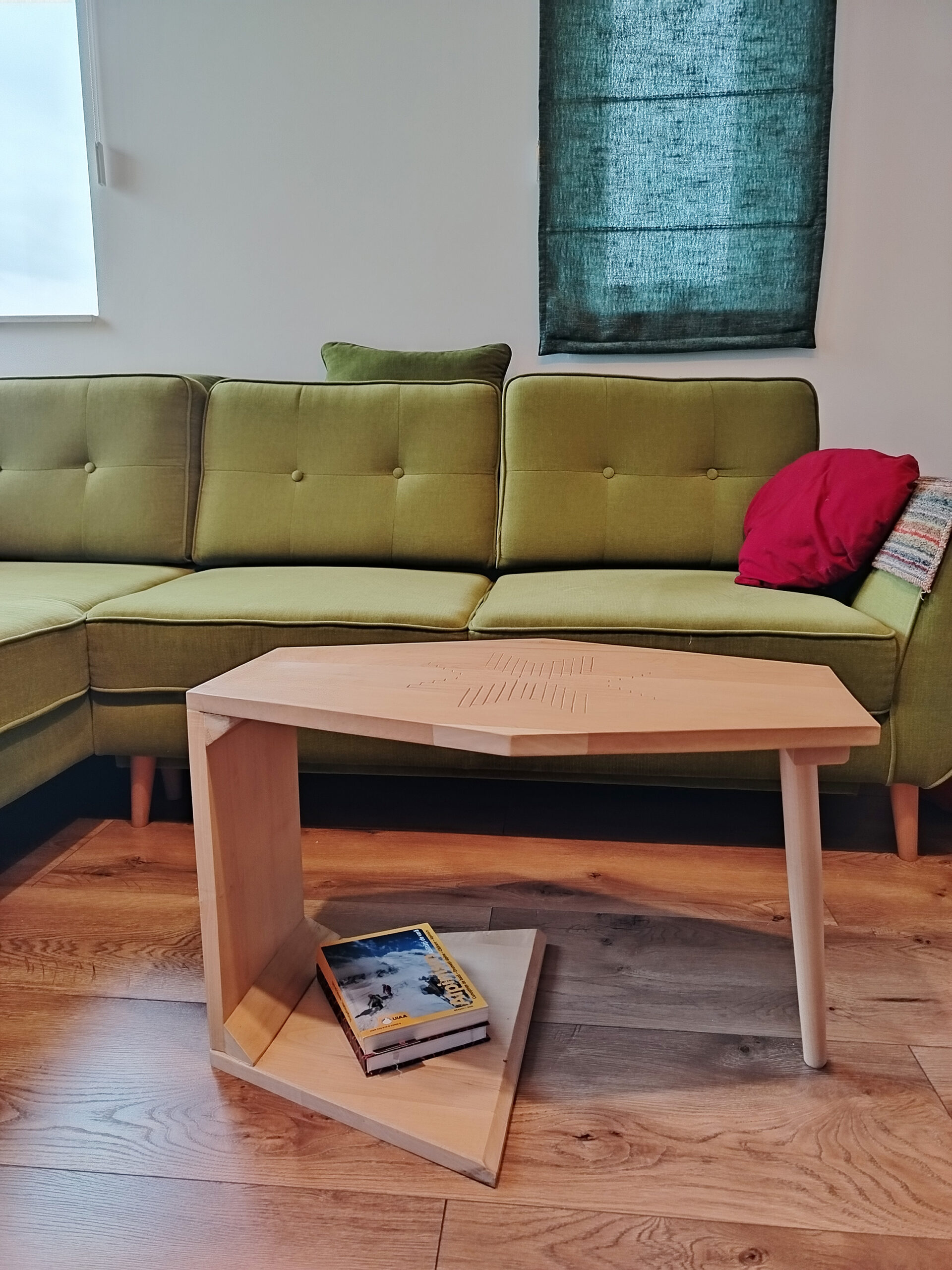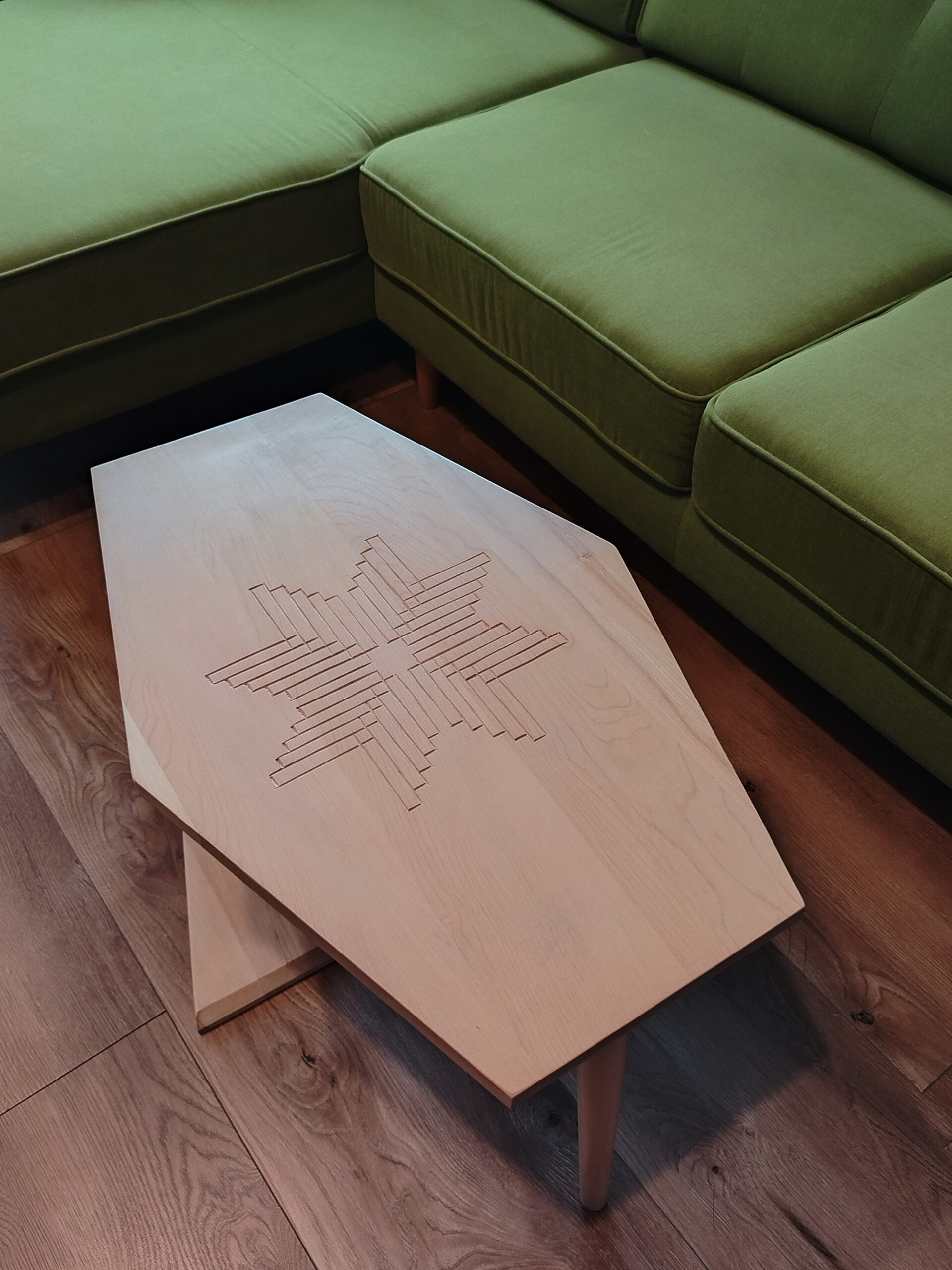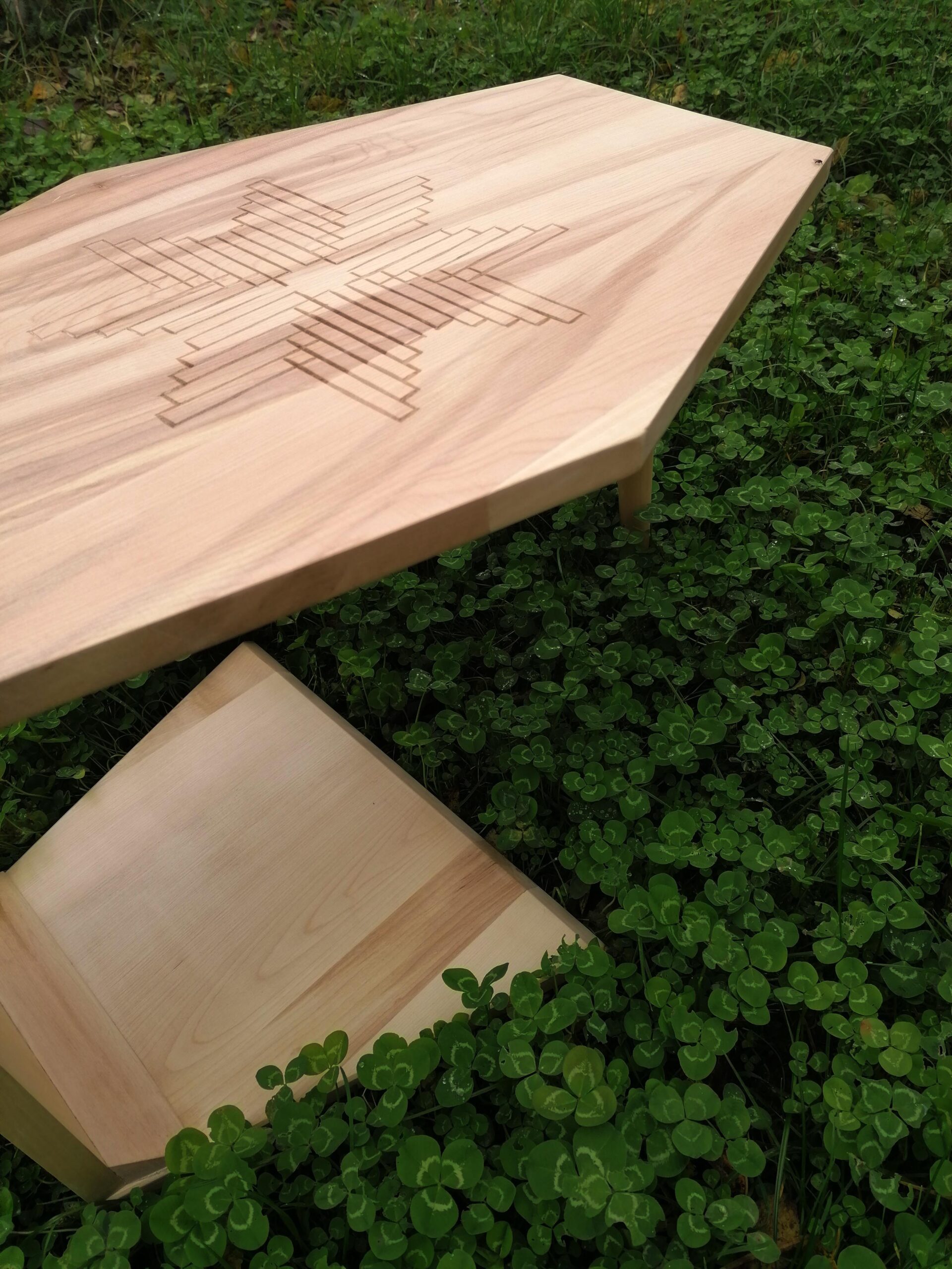 Steaua cu 8 colțuri simbolizează echilibrul, speranța și regenerarea. Crestată cu dalta pe o măsuță de cafea.