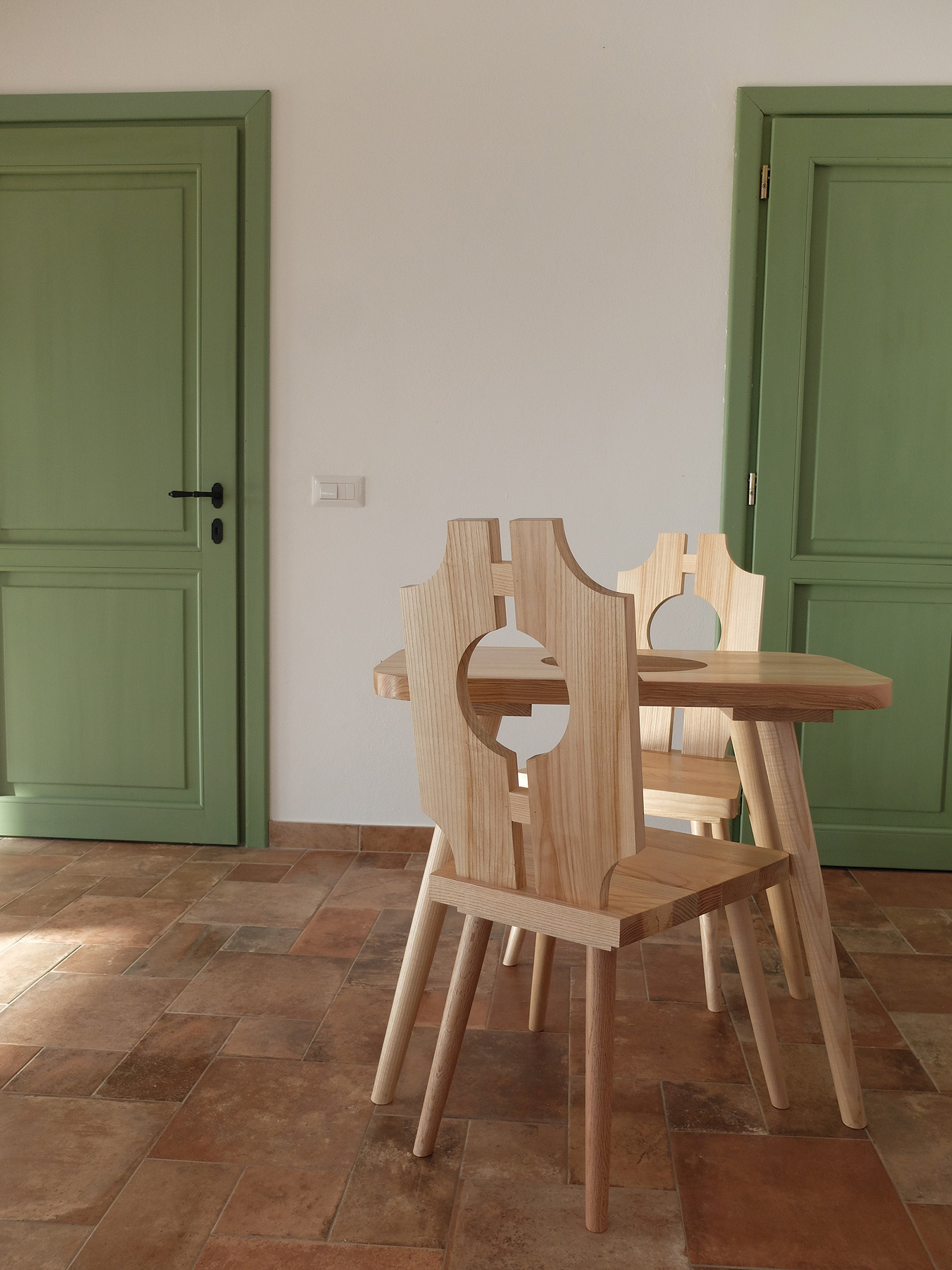 Camera cu „motivul cercului secționat”. Colecția de mobilier inspirată din filosofia lui Brâncuși și operele lui, pentru o pensiune din satul Hobița.