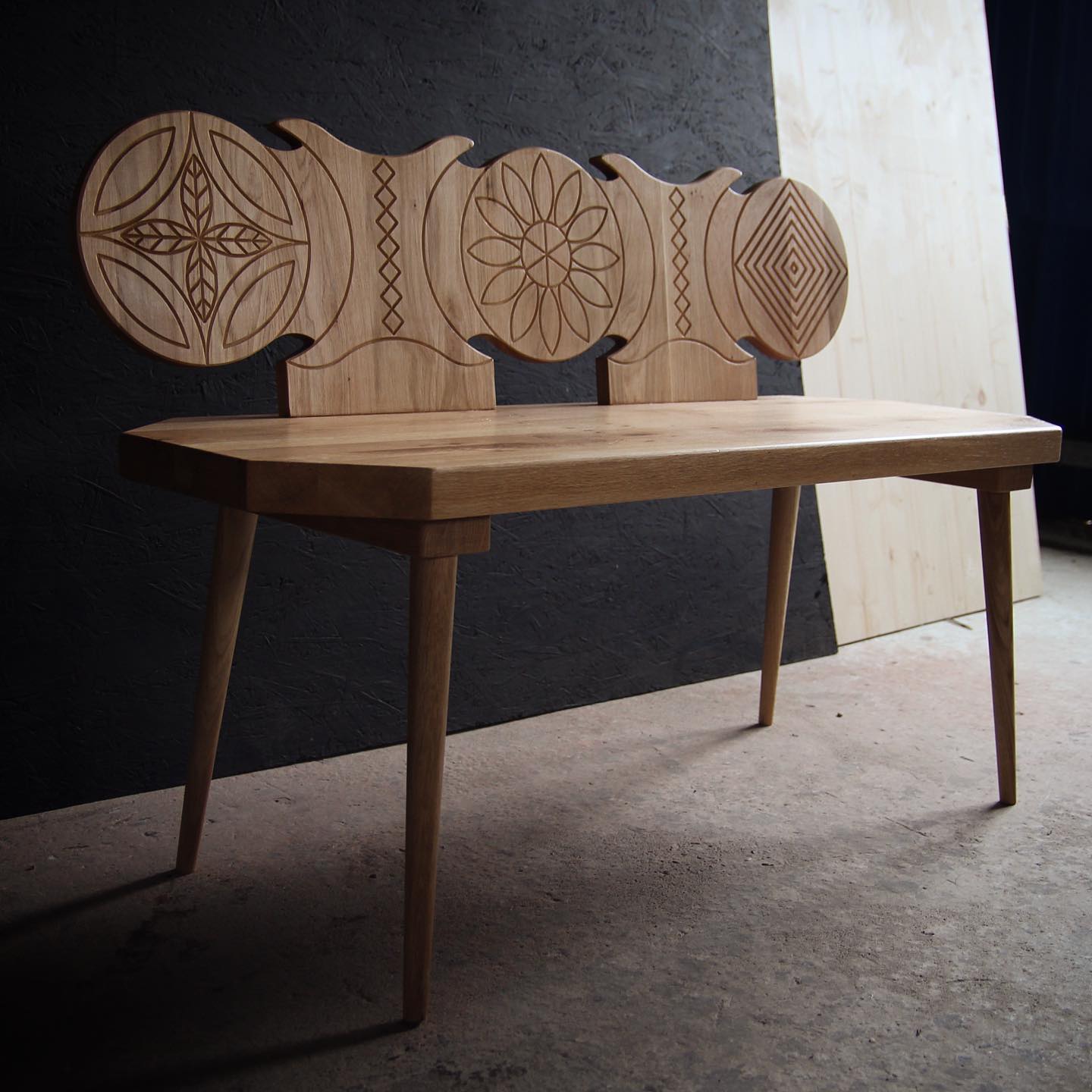 Ca tehnică de realizare este folosită sculptura manuală și decuparea pentru spătar, strunjirea picioarelor, îmbinări dulgherești ale șezutului cu partea decorată. Finisajele vor fi naturale, cu ulei de in.